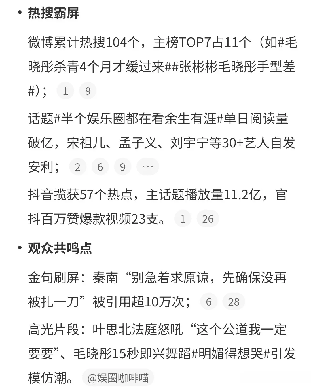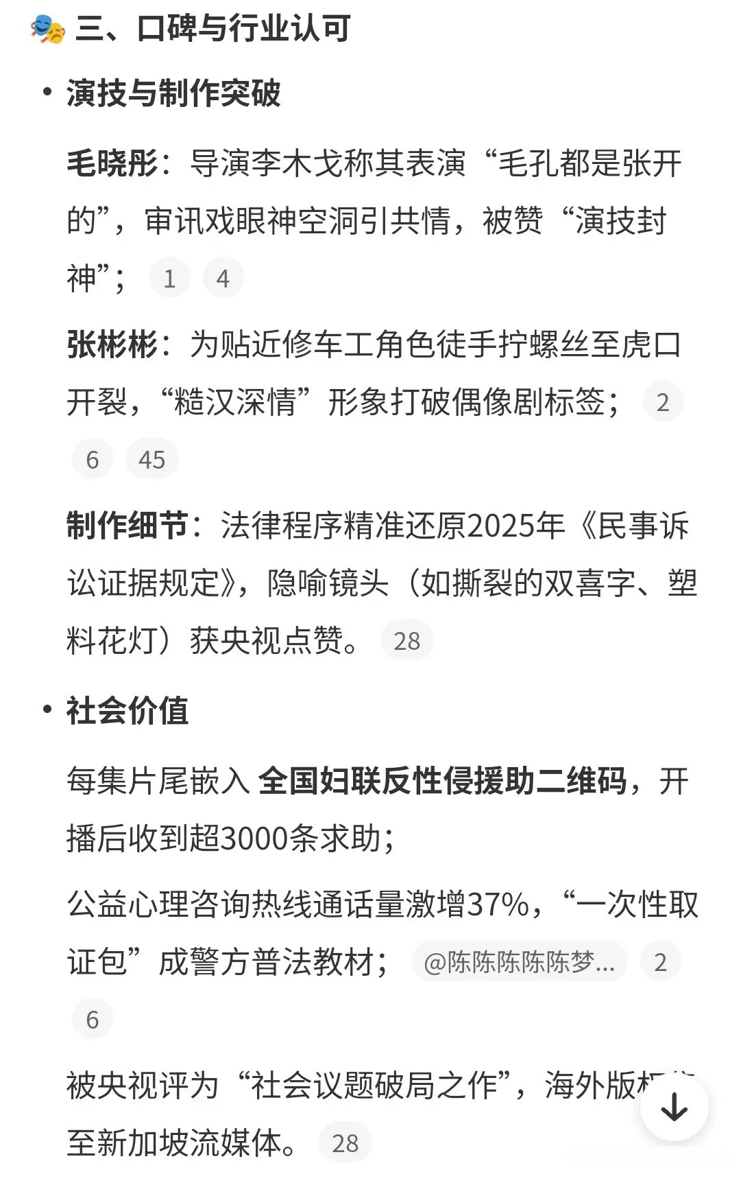 它的影响力早已超越娱乐本身:片尾植入的心理咨询热线通话量激增37%,妇联热线量翻倍,与权威媒体联合发布的“侵害后24小时自救指南”被警方用作普法教材,甚至推动上海外企取消商务酒局、政法大学召开“灌酒入刑”研讨会。没有强行圆满的结局,却用“绝境中仍有光亮”的内核,让观众明白“看见苦难、等待真相本身就是力量”